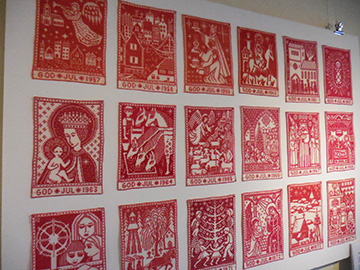 外壁が水色の小さな郷土史ミュージアムへ。 2023年まで続いたクリスマスのシリーズのうち Inga Palmgrenデザインの1957-2000年を展示。 他にも昔の刺繍作品などが飾られていました。
