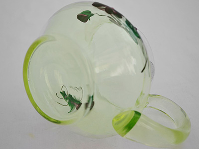 | Johansfors, Sweden ウランガラス ジャグ ハンドペイント 10.5×13.5cm 高さ:9.4cm 濃い紫色の花がハンドペイントされた 吹きガラス製の黄色いジャグ。 ウランガラスのためブラックライトをあてると はっきりとした緑色に発光します。 ハンドル付近にHandmalat(ハンドペイント)と 書かれたシールが貼られています。 底に吹きガラスを切った跡があります。 ガラス内部に小さな気泡が見られますが 特に目立つダメージの無い良好な状態です。 |