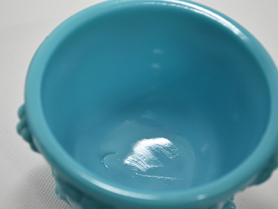 | Portieux Vallerysthal, France プレスガラス ボンボニエール オパリン 直径:11cm 高さ:14.5cm 1700年代初頭に設立されたガラスメーカーの プレスガラス製ボンボニエール。 作られた時代は1900年前後です。 トルコ石のような水色のオパリンガラスです。 葡萄の葉と果実が立体的に装飾されています。 プレスガラス特有の結合部分のラインが見られます。 また、内側に製造時からのへこんだ箇所がありますが 特に目立つ使用感の無い良好な状態です。 |