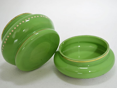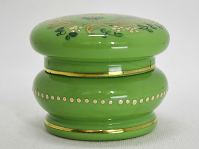 | トリンケットボックス ハンドペイント 直径:7.2cm 高さ:5.7cm アールヌーボー調のハンドペイントが施された 吹きガラス製の蓋つきボックス。 乳白グリーンのオパリンガラスに 金彩や花模様などがエナメル装飾されています。 1900年前後に作られたものと思われます。 底に吹きガラスを切った跡が見られます。 金彩に軽い薄れ、本体やふたの口まわりの処理に 少々雑に感じられる部分がありますが 古い時代の物ならではの趣が感じられます。 |