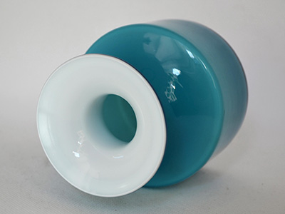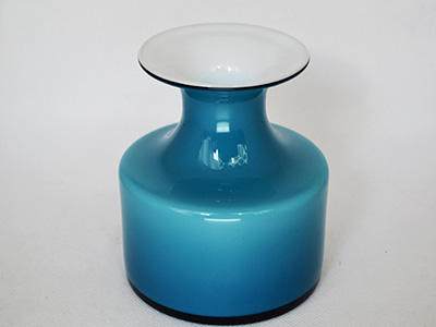 | Holmegaard, Denmark Carnaby ベース ターコイズブルー 1968年 デザイナー: Per Lutken 直径:8.9.cm 高さ:10.5cm 1940年代から1990年代にかけてホルメゴーの 人気デザイナーとして活躍したPer Lutkenの Carnabyシリーズから被せガラスのフラワーベース。 光を通さない白いガラスに透明感のある青を重ねて 生み出された爽やかなターコイズカラーです。 ガラスという素材の枠を超えた自由な表現が感じられます。 特に目立つ使用感の無い良好な状態です。 |