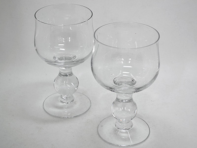 | Boda, Sweden ワイングラス H40シリーズ 吹きガラス デザイン: Erik Hoglund 1964年 直径:8cm前後 高さ:14cm前後 エリック・ホーグルンドといえば アート要素の強いオブジェ作品のイメージが強いですが 日常生活用のグラスもデザインしています。 これはその中でも人気の高かったH40シリーズです。 クリスタルボールのように丸いステム部分など 遊び心が盛り込まれたデザインです。 吹きガラスのためサイズや厚みなどの仕上がりが 個体により微妙に異なります。 側面のスクラッチや内部に小さな気泡が見られますが 全体的には比較的良好な状態を保っています。 |