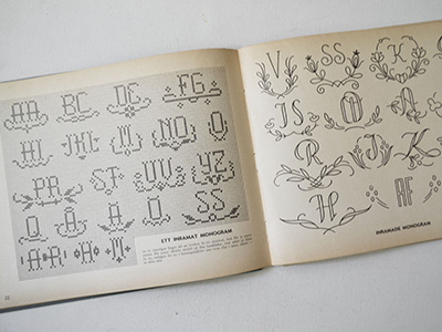 | Mark Modernt Humodern 1946年出版 48ページ スウェーデン語 ハードカバー スウェーデン女性向けに料理や手仕事など 広い分野を取り上げた情報誌"Husmodern"の 特別編集版として出版されたモノグラム本です。 クロスステッチや様々な刺繍技法を用いたアルファベット、 ベッドリネンなどを装飾するホワイトワーク、 クラシック、モダン、ポップなど豊富なスタイルで 生活様式や用途に合わせて使い分けられる モノグラムデザインが満載の内容です。 当時の王室メンバーのモノグラム刺繍入り テキスタイルの写真もいくつか紹介されています。 表紙に軽い汚れや角の擦れ、 経年による紙質の黄ばみが目立ちますが 内容的には書き込み等の無い良好な状態です。 |
