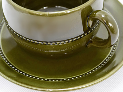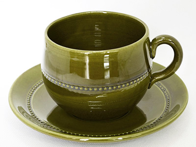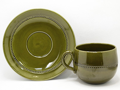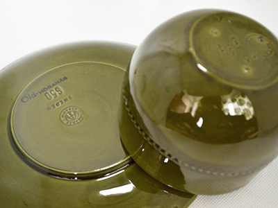 | Hoganas, Sweden Old Hoganas ティー・カップ&ソーサー オリーブグリーン デザイン: John Andersson 1956-60年代 カップ 直径:10cm 高さ:8cm ソーサー 直径:17cm 北欧モダンデザインにおいて重要な役割を果たした 国際博覧会(H55)に出品され、ホーガネスの定番として 長年愛されたOld Hoganasシリーズのカップ&ソーサー。 カラーは1970年代末まで続いたオリーブグリーンです。 今回入荷分は初期に生産された陶器素材となります。 (1970年以降はストーンウェアとして生産) 裏底にはマークとモデルナンバーが入っています。 カップの内部に釉薬の気泡が見られます。 また、ソーサーのふちにざらつく部分があります。 釉薬の色むらなど素朴な素材感の仕上がりです。 ソーサー表面の粒が並んだ装飾部分に 立体感や形のばらつきが感じられます。 |