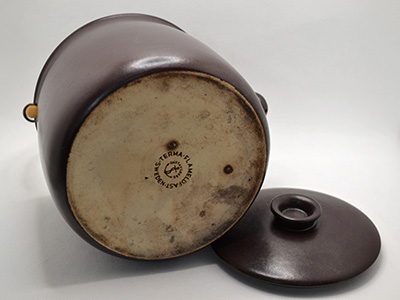 | Gustavsberg, Sweden Terma ティー;ポット デザイン: Stig Lindberg 1955年 15.3(直径)×18.5cm 高さ:14cm(ふたのつまみまで) 1955年にスウェーデン・ヘルシンボリで開催された H55国際博覧会は北欧デザインのパイオニア達が集結し 新しい時代の幕開けとなりました。 その博覧会でリンドベリが発表したのが調理器具と食器の 機能を兼ね備えたTermaシリーズです。 表面はわずかなスクラッチ程度のきれいな状態です。 底部分には火にかけて使用した形跡が見られ、 竹製ハンドルの繋ぎ部分に亀裂が入っています。 (一番下の写真参照) |
