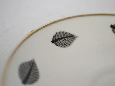 | Gustavsberg, Sweden コーヒー・カップ&ソーサー デザイン: Stig Lindberg カップ 直径:7.6cm 高さ:6.2cm ソーサー 直径:12.8p リンドベリ1955年に手掛けたボーンチャイナのSGモデルに リーフ柄と金彩のトリムで仕上げたカップ&ソーサー。 繊細な雰囲気の中にもリンドベリらしい ファンタジーなタッチが感じられます。 使用感の少ない良好な状態ですが ソーサーのふちに経年による ボーンチャイナ素材の変色が見られます。 (一番下の写真参照) |