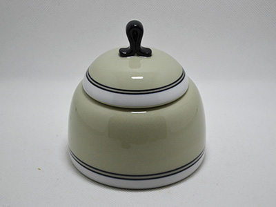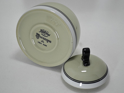 | Rorstrand, Sweden Nocturne シュガーポット デザイン: Jacqueline Lynd 1979-87年 直径:10.2cm 高さ:10.5cm(ふたのつまみまでの高さ) ドーム型のストーンウェア製ふたつきポット。 丸みを帯びたフォームとふたのつまみ部分の リボンのような装飾など遊び心あふれるデザインです。 使用感の少ないとても良い状態です。 |