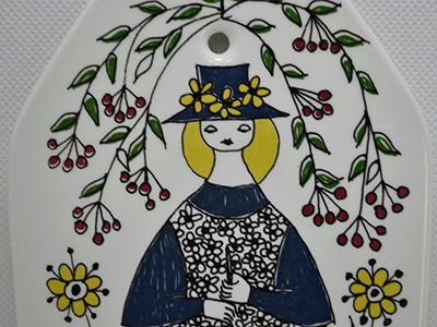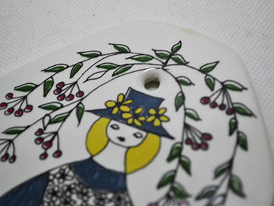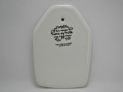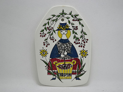 | Figgjo, Norway Turi Design Mons og Mille カッティングボード/ウォールプレート デザイン: Turi Gramstad-Oliver 10.6×15.4cm ベリーのジャムを作る帽子姿の女性が描かれた 小ぶりなサイズのカッティングボード。 北欧の食文化を可愛いタッチで表現しています。 チーズや北欧のオープンサンドイッチ用の食器として、または 上部に穴が開いているためインテリアとしてもおすすめです。 上部にそれ程目立たない薄い着色がありますが 全体的には良好な状態を保っています。 |