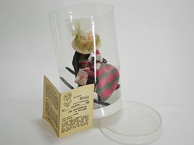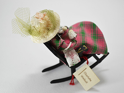 | Charlotte Weibull, Sweden ハンドメイド人形 ロッキングチェアと女性 高さ:10cm 正面横幅:4.5cm サイド横幅:8cm (座った状態のサイズです) 1900年前後の洋服をまとった女性の人形です。 レーストリムのチェック柄ドレス、レースのバッグ、 花とチュールが装飾された帽子などをまとった貴婦人が ペイント装飾を施した黒い木製椅子に座っています。 小さく可愛らしい雰囲気です。 1968年発行の英語版小さな人形新聞が付属します。 (経年により紙質に黄ばみが見られます) チューブ型アクリルボックス入りです。 |