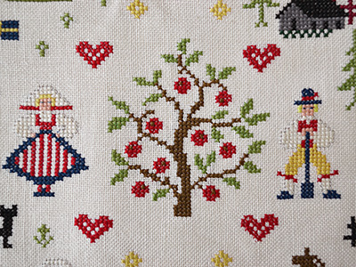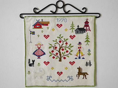 | クロスステッチ タペストリー ハンガー付き 横26×縦26.5cm、 ハンガー幅: 29cm 赤い実をつけたリンゴの木を中心に 民族衣装をまとった男女や 農村部にまつわるモチーフが クロスステッチされたタペストリー。 リンゴの産地として有名な スウェーデン南部オスターレン地方を イメージして作られたのかもしれません。 1970という数字が上部に入っています。 生地に小さな汚れや傷みが見られます。 また、ハンガーの塗装に小さな剥がれ、 裏地に薄い黄ばみが見られます。 |