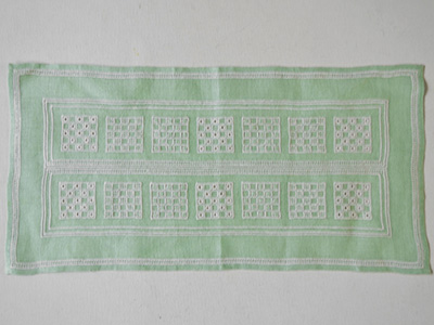 淡いグリーンの麻布に白い糸で装飾を加えた作品。