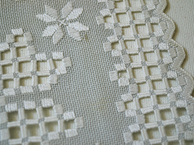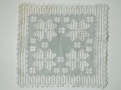 | Hardangersom ハダンガー刺繍 (ハーダンガー刺繍) 32×29.5センチ 淡いグレーのハダンガー刺繍。 オープンワークの花と白い小花刺繍の やさしい雰囲気が感じられる作品です。 ノルウェーの伝統刺繍であるハダンガーは スウェーデンのナーベルソム同様に、イタリアから伝わった ドロンワーク刺繍が発展し独自の形となったと言われています。 生地の一部に小さな汚れがあります。 (一番下の写真参照) |