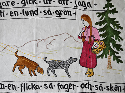 | アーヌーボー刺繍 タペストリー Jugendbroderi スウェーデンの民族音楽 ハンターの歌 84×49センチ スウェーデン・ダーラナ地方の民族音楽ラブソングを 刺繍タペストリーで表現した作品。 1人のハンターが狩りに出かけ 色白の美しい女の子に会うという物語です 麻布のざっくりとした風合いと、糸で埋め尽くした刺繍の 質感のコントラストが独特な世界観を繰り広げます。 生地にピン止めをした錆跡の着色が数か所に見られます。 時間を経た古いものならではの独特な 味わいが感じられる作品です。 |
