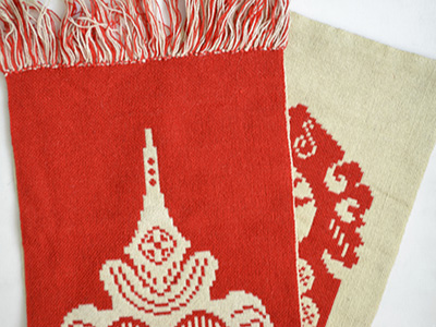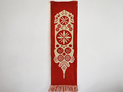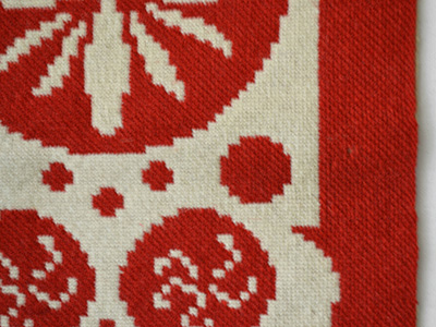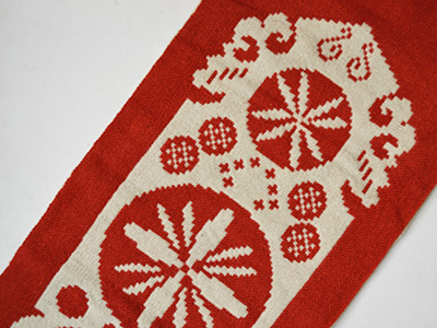 | フィン織 ロングサイズ 赤 スウェーデン 横35×縦113cm +フリンジ約10cm アルモーゲ(民族調)スタイルの装飾デザインを 赤と白のウールで表現したフィン織/二重織。 フォークロアなムードが感じられます。 表と裏では色の敗色が反転します。 上部にハンガー等が通せるつくりです。 赤い面の中央右側に小さなほつれが見られます。 (一番下の写真参照) |