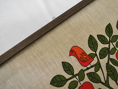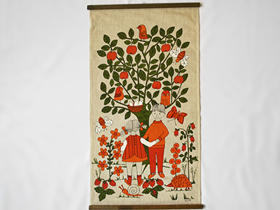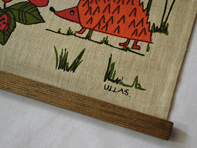 | Ullas リネン・タペストリー ハンドプリント スウェーデン 横32×縦59cm デザイン Ulla Scheuer 1950年代後半から80年代まで テキスタイルデザイナーとして活躍したU. Scheuerの ファンタジーに満ちあふれたイラストが ハンドプリントされたリネン・タペストリー。 上下部分は32.5センチの木棒で固定され、 上部には飾り用のフックがついています。 右下部分にUllasのサインが入っています。 生地全体にうっすらとした黄ばみが見られるほか、 少年の足元とハリネズミの間に薄い汚れがあります。 ヴィンテージとしてはそれなりに良好な状態です。 |