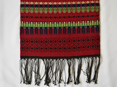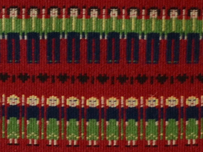 | Bundenrosengang ブンデンローゼンゴング織 タペストリー ハンガー付き スウェーデン 30×49cm(織部分のサイズ) +約10cm(フリンジ) 落ち着きのある深いボルドー・カラーを中心に、 連続模様で男女の姿が続くブンデンローゼンゴング織。 丁寧に仕上げられた作品です。 上部に取り付けられたハンガーの幅は31.5センチです。 フリンジの束を結んでハンガーに固定しています。 (一番下の写真参照) |