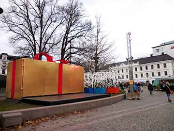 ツリーが点灯され街行く人々が少し浮かれています。 アドベント期間のイベント用に巨大なプレゼントも登場! 実は開くとステージになるみたいです。