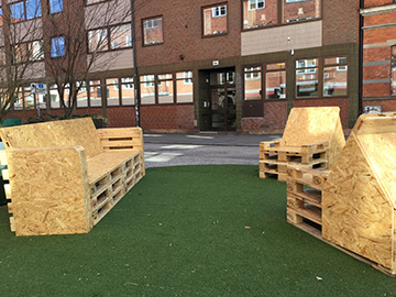 マルメのTriangeln駅近くにある歩行者専用ストリートに 廃材パレットを再利用した憩いのスポットが登場! この応接セット、コンセプトは面白いですが 作りがかなり雑なので洋服が引っ掛かりそう。