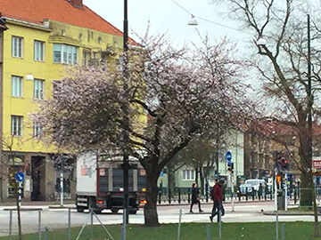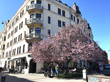 コーヒーが美味しいカフェの角には桜の木。 テーブルが配置されているのでお花見気分ですね。 スウェーデン南部の桜はそろそろ散り始めています。