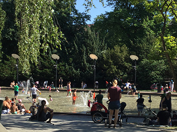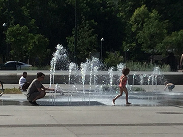 5月もあと少し。真夏のような天気のスウェーデンです。 噴水などの水の吹き出す所は一瞬にして水浴び場に。 こうやって北欧の子供達はたくましく育つのですね。 ・・・よく見たら大人も一緒になって遊んでました。