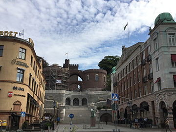 ヘルシンボリのシンボルでもある石造りの階段。 その先にはお城の名残りである塔が残っています。 階段横の有料エレベーターは何と定期券で利用可! 海の向こうにはデンマークが見えます。