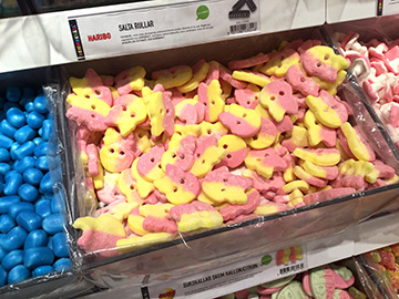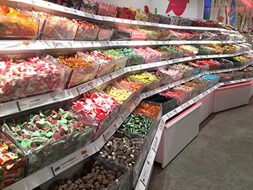 どこまでも続くカラフルな駄菓子。 健康食やオーガニックを好むスウェーデン人も この駄菓子の誘惑には抗えないようです。 正直なところどう見ても美味しそうには・・・。
