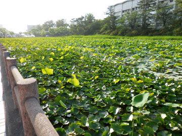 朝から雨でしたがその後は太陽がまぶしい1日でした。 いつの間にか公園のお堀は蓮で埋め尽くされています。 私がスウェーデンに帰るまでに花が咲くかしら?