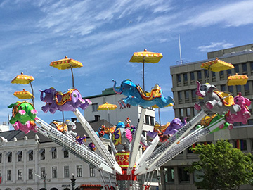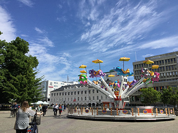 いつの間にか広場に設置されていた簡易遊具。 派手な色合いで景観から浮きまくっています。 雨マークの予報に反して晴れ間の多い一日でした。 北欧の天気予報はあまり当てになりません。