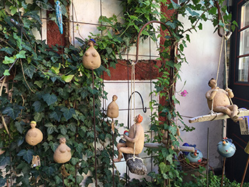 雨上がりの日差しがまぶしい土曜日の午後。 小さな路地の先の可愛い家に不思議な花が・・・ と思ったらクラフト作家によるオブジェでした。 小さくて不思議なヒトタチも潜んでいます。