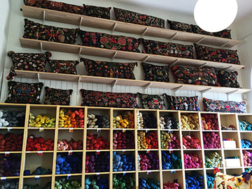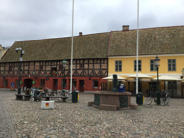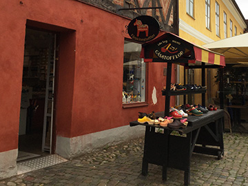 ぐずついた天気のせいで空が薄暗いスコーネです。 もう既に夏が遠い昔のように・・・。 石畳の広場は古い建物に取り囲まれています。 その中の木靴店の看板はダーラナホースでした。