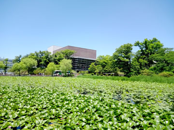 1週間前にプレオープンを迎えた芸術劇場ミルハス。 名前の由来でもある蓮で埋め着くされたお堀からは カワセミの歌声が響き渡ります。