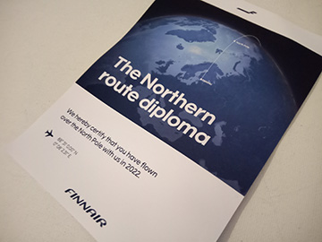 北極圏上空ルートでスウェーデンに戻りました。 通過の際に写真のような証明書も機内で配布。 朝4時台にフィンランド着。乗り換え手続きの際は アザラシのオブジェがお出迎えしてくれました。