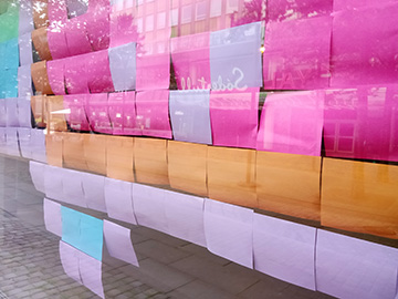 空き店舗の窓にカラフルなデコレーション。 "GLAD SOMMAR"(楽しい夏を!) なんだか折り紙っぽいけど・・・と近づいてみると いっぱいの付箋!でした!!