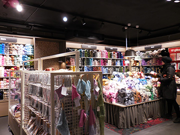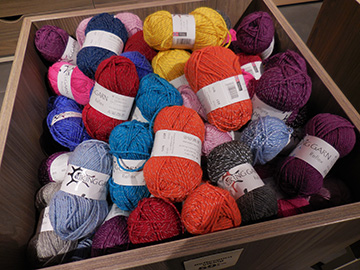 街中の本屋に何故か本格的な毛糸のコーナー。 おしゃれなニット本も充実していました。 キラキラ光る毛糸は反射材の糸入りだそうです。 真っ暗な冬に大活躍のあったかグッズが作れそう。
