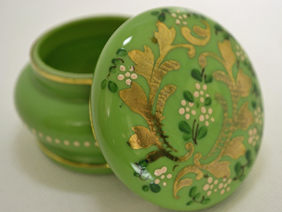 | トリンケットボックス ハンドペイント 直径:7.2cm 高さ:5.7cm アールヌーボー調のハンドペイントが施された 吹きガラス製の蓋つきボックス。 乳白グリーンのオパリンガラスに 金彩や花模様などがエナメル装飾されています。 1900年前後に作られたものと思われます。 底に吹きガラスを切った跡が見られます。 金彩に軽い薄れ、本体やふたの口まわりの処理に 少々雑に感じられる部分がありますが 古い時代の物ならではの趣が感じられます。 |