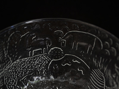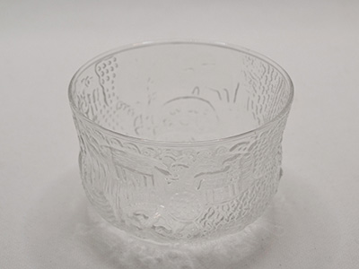 | Nuutajarvi, Finland Fauna デザート・ボウル クリアカラー デザイン: Oiva Toikka 1970-84年 直径:9.5cm 高さ:6cm あちこち動物たちの姿がエンボスされたFaunaシリーズから ひとり用にちょうど良いサイズのボウルです。 ガラスの中に草原の物語を閉じ込めたようなデザインです。 ティーライトキャンドルを入れて使うと ガラスの立体感を通じて幻想的な雰囲気が楽しめます。 特に目立つ使用感の無い良好な状態です。 |