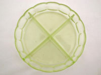 内側が4つに仕切られた薄いグリーンのプレスガラスのディッシュ。