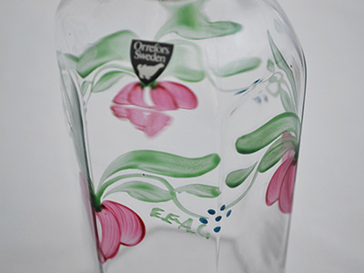 | Orrefors, Sweden Maja ボトル デザイン: Eva Englund 1977年 直径:8.4cm 高さ:19cm (コルク栓を含む高さは20cm) 1974年から1990年までオレフォスで活動したE. Englundが手掛けた ハンドペイント装飾が施されたMajaシリーズのボトル。 Allmoge(アルモーゲ/農村地帯の民族文化)スタイルの装飾が 繊細なクリスタルガラスに手描きされたシリーズです。 デザイナーとデコレーターそれぞれのサインが入っています。 (EE: Eva Englund, AL: Arne Lindblom) Orreforsのシールが残っています。 コルク栓に軽い使用感が見られる以外は 特に目立つ使用感の無い大変良好な状態です。 |