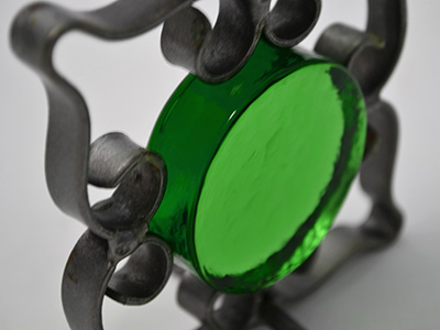 | キャンドルスタンド アイアン&ガラス 横:9.4×縦:13.5cm 幅:5.8cm 中央のガラス直径: 4.9cm 丸いガラスをアイアンワークで囲んだ レトロなデザインのキャンドルスタンドです。 直径2センチのキャンドル用となります。 内側に軽いキャンドルのワックス跡、 アイアンの溶接部分などにわずかな錆が見られますが 全体的には良好な状態を保っています。 |