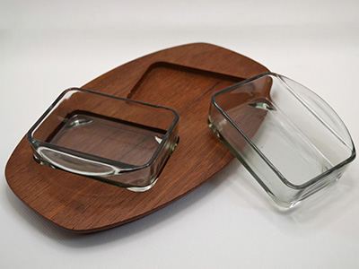 | ガラスディッシュ2個セット チーク製トレイ付き ディッシュ: 9.5×7.8cm 幅:3cm トレイ: 23.2×14.8 幅:1.5cm スモーキーカラーのプレスガラス製ディッシュ2個と チーク製トレイを組みわせたセット。 少しひねりを効かせたスタイリッシュなデザインです。 刻印やシールはありませんが、ディッシュの形から デンマークのHolmegaard製と思われます。 チークに軽いスクラッチや色むらが見られますが 全体的にはとても良い状態を保っています。 |
