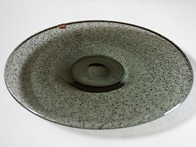 | Hyllinge Glashytta, Sweden Stromboli プレート デザイン: Bengt Orup 1964年 直径: 28cm 無数の黒い粒子が混入されたプレートです。 ガラス内部には細かな鉄のスラグが入っているため 表面に軽い盛り上がりが感じられます。 透明感のあるガラスのイメージを覆し 敢えて歪な趣を加えた野性的な作品です。 1950年代にJohansforsのアートディレクターとして 活躍したBengt Orupは、1963年から1966年の間 新しくスタートしたばかりのガラス工房Hyllingeに 制作活動の場を移しました。 表面や底部分に軽いスクラッチがありますが 全体的には比較的良好な状態です。 |