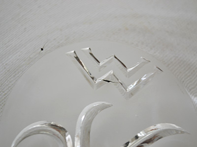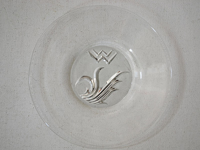 | Elme Glasbruk, Sweden プレスガラス プレート クリアカラー デザイン: Edvin Ollers 1926-30年 直径:16cm 陶器やガラス、メタル製品など様々な分野で活躍し、 普段使いの生活用品に質の高いデザインを提供した Edvin Ollersが1920年代に手掛けたプレート。 アールデコ期を象徴するデザインが魅力的です。 中央部分は裏側が艶の無いすりガラス加工です。 ガラス内部に気泡、表面に軽いスクラッチが見られます。 在庫のうち1枚は小さな黒い不呪物が混入しています。 (一番下の写真参照) |