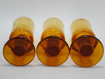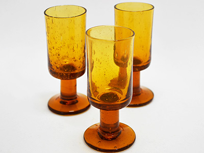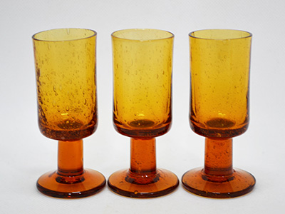 | Boda, Sweden ショットグラス3個セット アンバー・カラー デザイン: Erik Hoglund 上部直径:3.5〜3.6cm 底直径:4.1〜4.4cm 高さ:9〜9.2cm バルト海の琥珀のような色合いをした小さなグラス。 ひとつひとつガラス内部の気泡の入り方が異なり、 また仕上がりサイズもそれぞれ微妙に差があります。 違いを見比べるのも面白そうです。 1950年代後半にエリック・ホーグルンドが打ち出したのは 当時の主流であった洗練されたガラス製品とは全く異なる いびつで肉厚なフォームの作品達でした。 その斬新な試みに人々は心を奪われました。 ふち部分は気泡のためわずかなへこみが感じられます。 (欠けや傷ではありません) |