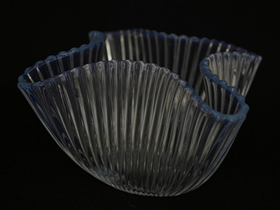 | Gullaskruf, Sweden Reffla ベース Opalin 1952-1972年 デザイン: Arthur Percy 13.4×13.1cm 高さ:7.1cm GefleやKarlskronaのトップ・デザイナーでもあった Arthur Percyが1952年にガラスメーカーGullaskrufのために 手がけたプレスガラスのRefflaシリーズ。 色・形と様々なバリエーション展開が大人気となりました。 今回入荷分のベースは四つのヒダがついたタイプです。 ムーンストーンのような乳白がかった神秘的な色合いは 赤や緑の定番色と比べて流通が少なかったそうです。 ガラス内部に小さな気泡が入っていますが 特に目立つダメージ等は見られません。 |