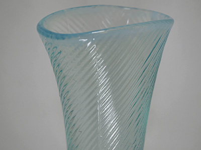 | Afors Glasbruk, Sweden Italia フラワー・ベース 1950-60年代 8.5×6cm 高さ:18.2cm スウェーデンのガラスメーカーAfors(オーフォス)より オパールセント加工が施されたItaliaシリーズの花瓶。 爽やかなブルーに神秘的な乳白色の組み合わせです。 1876年にスモーランド地方に設立されたAforsは Bertil VallienやUlrika Hydman Vallienなどの作家達が所属し、 スウェーデンのガラス界において華々しい時代を築きました。 その後、時代の流れでBoda, Kosta等と合併する事となります。 内側に薄いカルキの筋が見られます。 表面にプレスガラスのつなぎ目のライン、 内部に小さな気泡の混入が見られます。 |