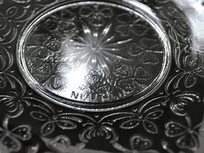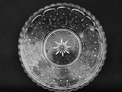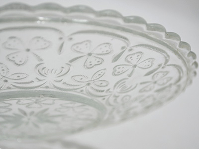 | Nuutajarvi, Finland Apila プレート デザイン: Kerttu Nurminen 1977年 直径: 16cm 1890年代に作られていた古いモデルを基に Nuutajarvi専属デザイナーであったK. Nurminenが 1977年に復刻させたApilaシリーズのプレート。 小さな粒でクローバー模様が装飾されたデザインです。 古いプレスガラス製品の雰囲気を残した作品です。 プレート表面のリム部分に沿って "Nuutajarvi 1893 1977"の刻印がエンボスされています。 全体的に良好な状態を保っています。 |