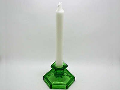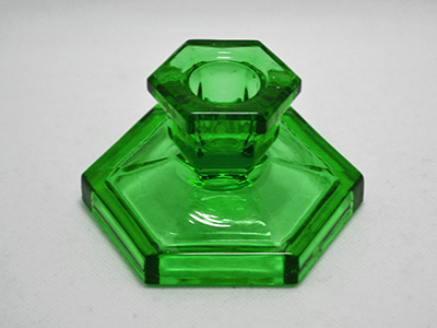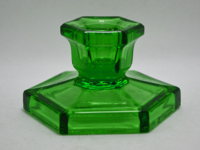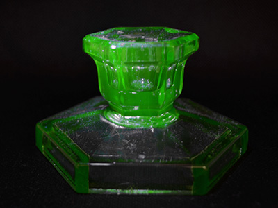 | キャンドルホルダー ウランガラス 直径:9.7cm 高さ:5.6cm 六角形のプレスガラス製キャンドルホルダー。 ブラックライトに軽く反応するウランガラスです。 1930年前後に作られたと思われる アールデコ・スタイルのデザインです。 台部分内側のカット処理が雑に施されているため 欠けている箇所が見られます また内部の気泡やプレスガラス結合のラインなどが ありますが全体的には比較的良好な状態です。 |