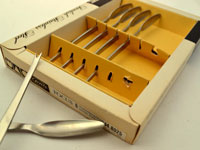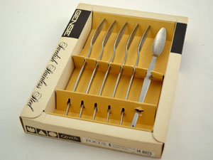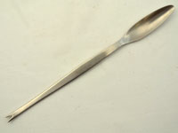 ![]() Gense, Sweden ロブスター・ピック・セット デザイン Folke Arstrom 長さ:20.2センチ 甲殻類などシーフード用のスリム&スタイリッシュなカトラリーのセットです。 ステンレス表面にごく軽い使用感が見られますが、全体的にはとても良い状態です。 6本箱に入ったセットです。 |