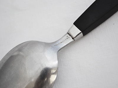 | スプーン 4本セット ステンレス&ベークライト 22×2.5cm ステンレスと黒いハンドルのモダンな組み合わせのスプーン。 ハンドル部分はベークライトが用いられています。 裏側にステンレスの刻印(ROSTFRITT STAL)が入っています。 ステンレスにス軽いクラッチ、ベークライト部分にも 若干の使用感がありますが、全体的には良好な状態です。 |