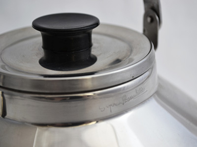 | Moderna Kok, Sweden コーヒー・ポット ステンレス&ベークライト デザイン: Sigvard Bernadotte 1954年 直径:17cm 高さ:12.5cm 容量:1.5リットル 1940年代にステンレスは手入れが簡単で丈夫であることから 理想的なキッチン素材として注目を集めるようになりました。 さらに1950年代に入るとデザイン性が重要視されるようになり 「デザイン界のプリンス」と呼ばれるSigvard Bernadotteが 手掛けたこのポットはモダンな生活様式の定番となりました。 ポットにはSigverd Bernadotteのサインが刻印されています。 ステンレスに軽いスクラッチがありますが、全体的には 使用感の少ない良好な状態です。